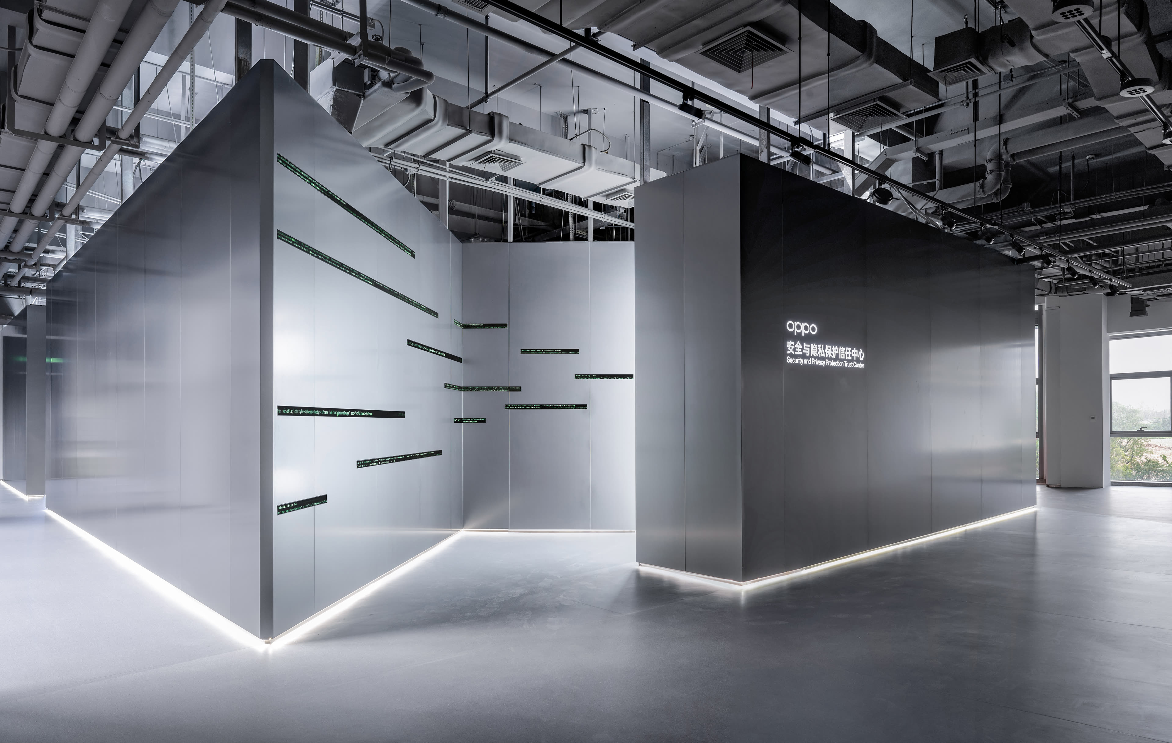 OPPO 安全与隐私保护信任中心展厅位于 OPPO 东莞数据中心二楼,展示面积约 200㎡。直径叙事受 OPPO 委托,负责展厅的策展设计及制作实施。展厅面向监管机构和合作伙伴,着重展示 OPPO 在网络安全与隐私保护领域的技术实力和社会承诺。直径叙事提取了安全、可信任的隐私保护和透明、公开的隐私监管两大核心理念,凝练为“坚固”、“透明”两大设计语言,以坚实的金属质感塑造展厅外部效果,以开阔、透明、轻盈调性营造内部空间体验,创造了一个由主题故事传递审美感受的品牌空间。